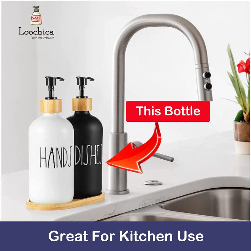 - DISHES BLACK Dispenser For Kitchen Use - Bottle contain Hands mark on the bottle. If you are having problems mix up or get asked “Which Soap is Which?", this would solve this problem well. The label is not only good for distinction glass soap dispenser with pump but also looks elegant.