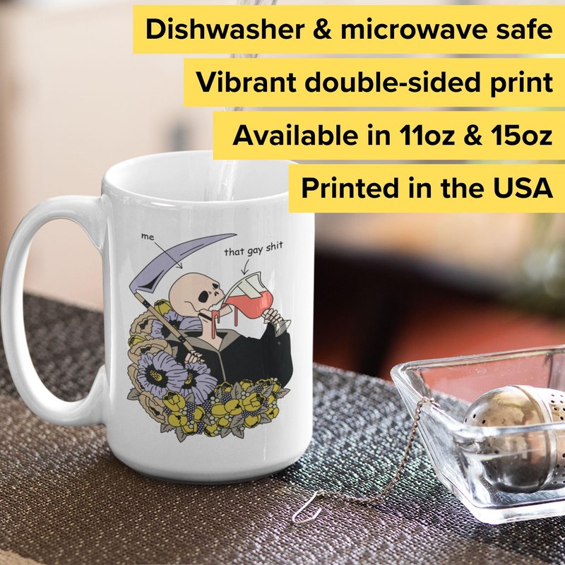 - MEME-INSPIRED SKELETON DESIGN HALLOWEEN COFFEE MUGS - This ceramic mug features a hilarious illustration of a skeleton chugging wine from a giant chalice, labeled with "Me" and "That gay shit." This big coffee mug is perfect for showcasing your sense of humor and pride.