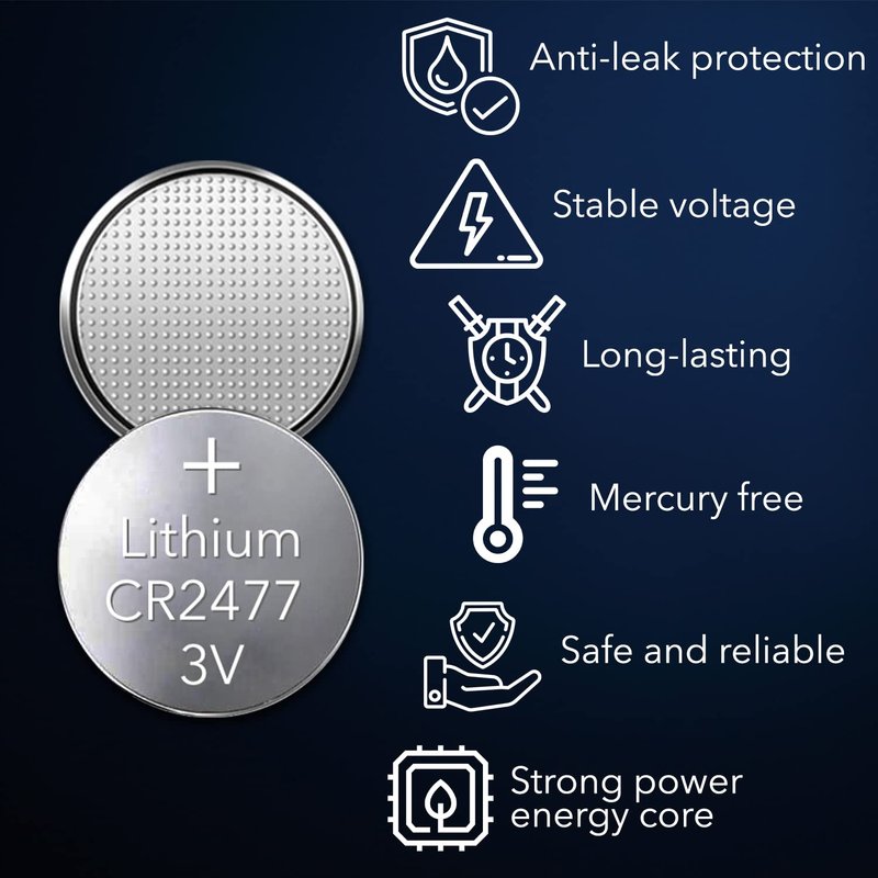 -Childproof packaging: Each CR2477 3V lithium battery comes in protective, tamper-resistant packaging. Remove individually before using.