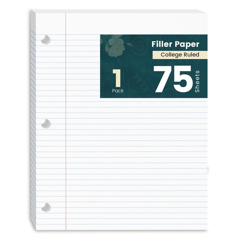 Loose Leaf Paper, 75 Sheets Notebook Lined Paper, 8 x 10.5 College Ruled Filler Paper, 3-Hole Punched Binder Paper for 3-Ring Binders, Double-Side Printed Note Pads for Home, Office, School, 1 Pack
