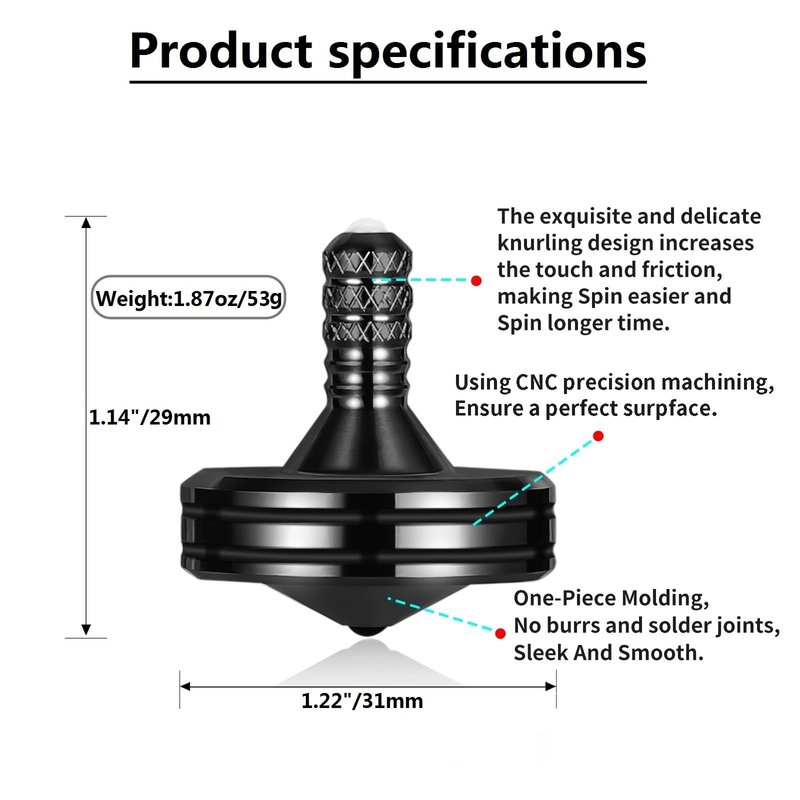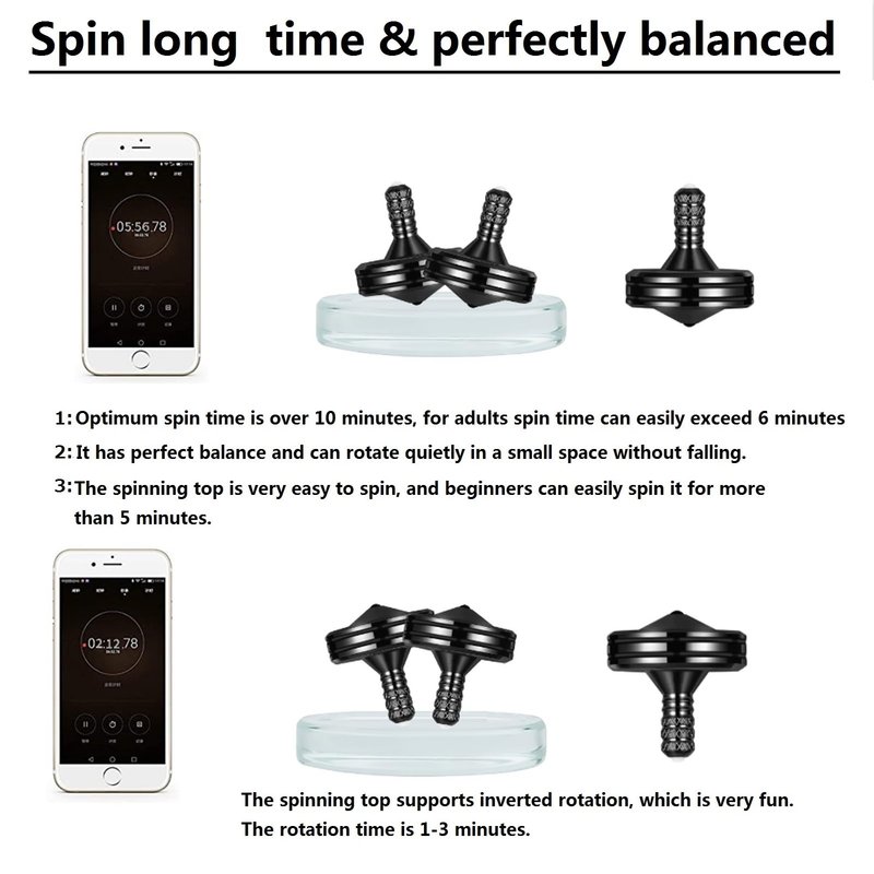 - 【Spin Long Time】The top has perfect concentricity and spins for a long time, and easy to spin, most people can spin for 3-5 minutes. For skilled adults, spinning time can exceed 8 minutes on the smooth concave crystal glass base.The top has perfect balance, when you spin well, the top floats there like it's still.