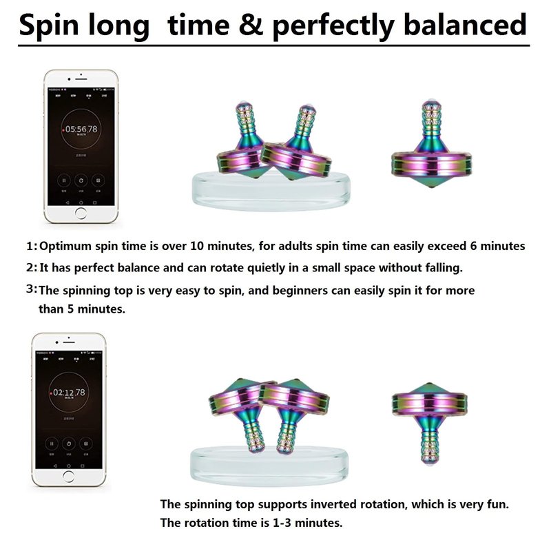 - 【Spin Long Time】The top has perfect concentricity and spins for a long time, and easy to spin, most people can spin for 3-5 minutes. For skilled adults, spinning time can exceed 8 minutes on the smooth concave crystal glass base.The top has perfect balance, when you spin well, the top floats there like it's still.