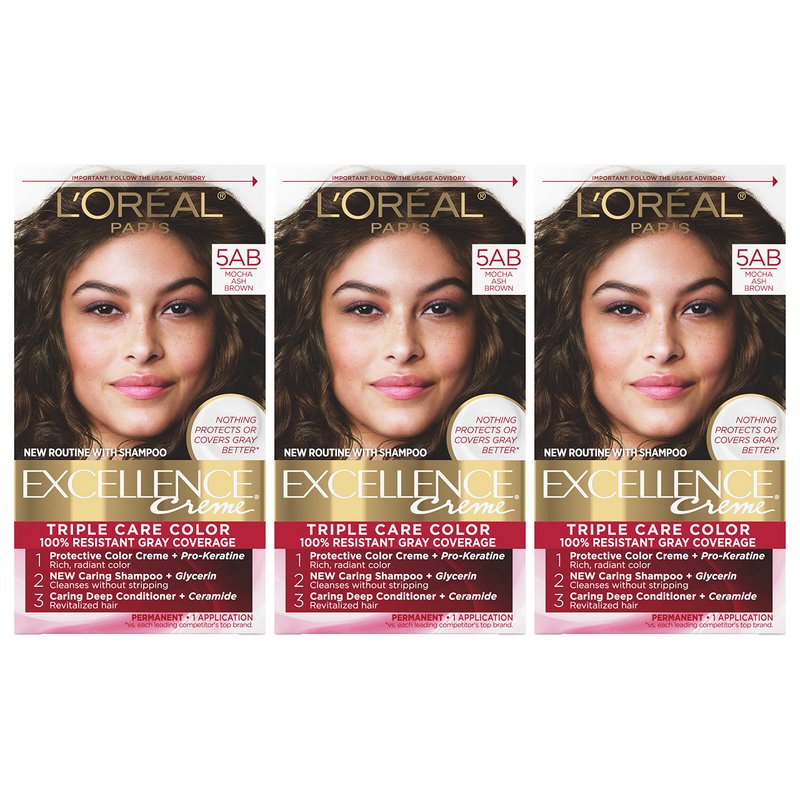 L'Oreal Paris Excellence Creme Permanent Hair Color, 5AB Mocha Ash Brown, 100 percent Gray Coverage Hair Dye, Pack of 3
