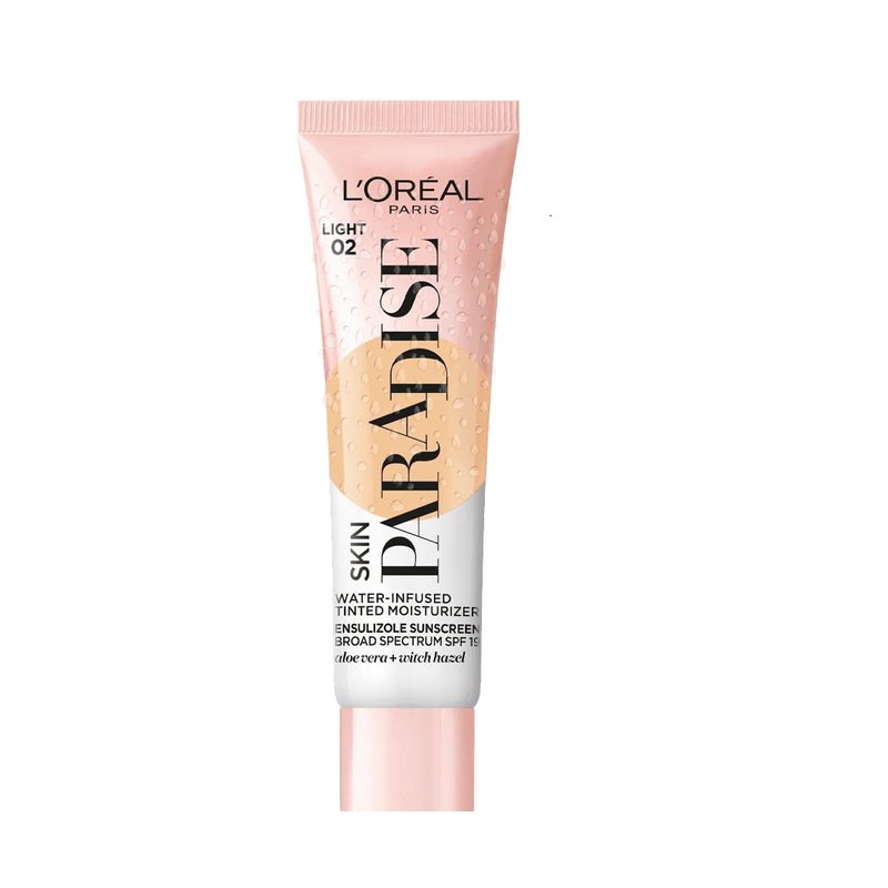 L'Oreal Paris Skin Paradise Water-infused Tinted Moisturizer with Broad Spectrum SPF 19 sunscreen lightweight, natural coverage up to 24h hydration for a fresh, glowing complexion, Light 02, 1 fl oz
