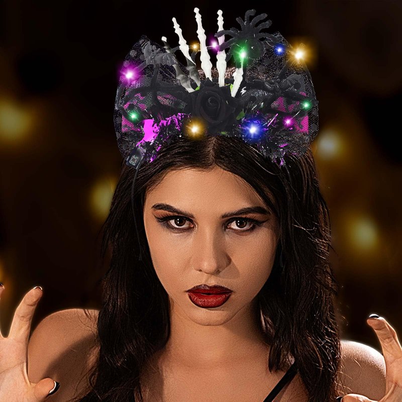 Lorealri Halloween Headbands Bow Hair Band Skull Light UP Cosplay Festival Decorations Party Hair Accessories for Women (Black Rose, Black)