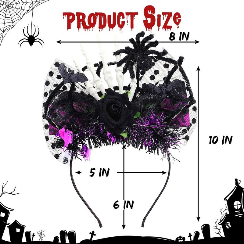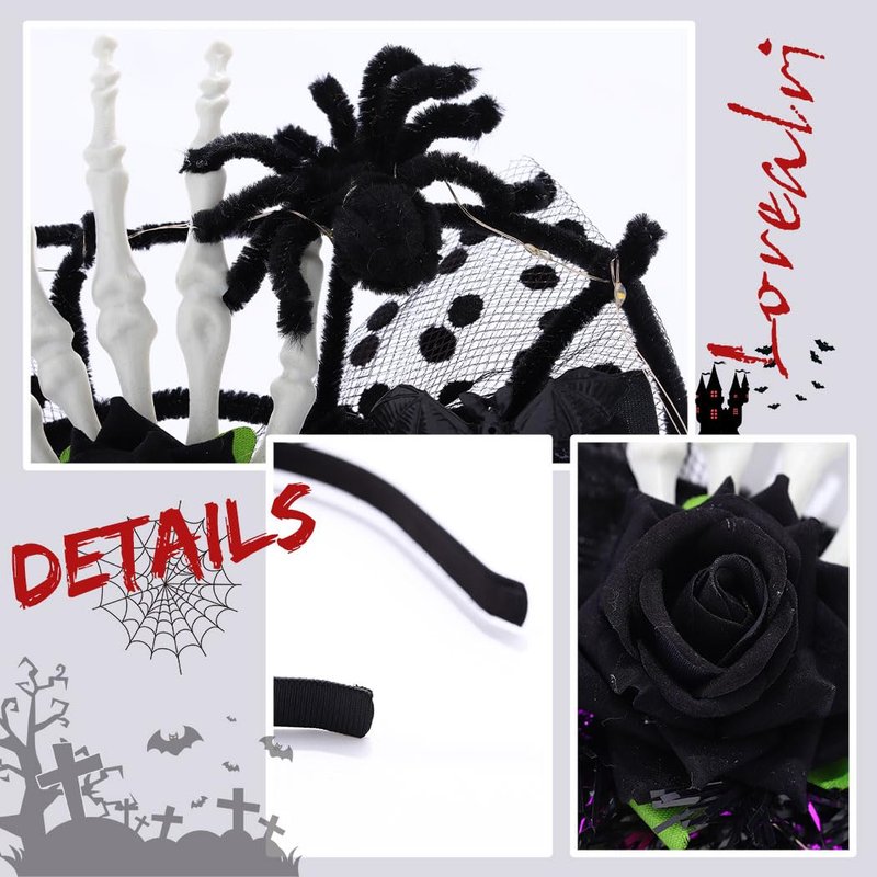 - Design: Featuring an intricately spread spider web adorned with a skeletal hand and a black rose, Black Rose Headband exudes eerie elegance. Accompanying the centerpiece are two small bats and spiders, adding a touch of spooky charm. Perfect for completing your ghostly look, this Halloween headband is sure to turn heads