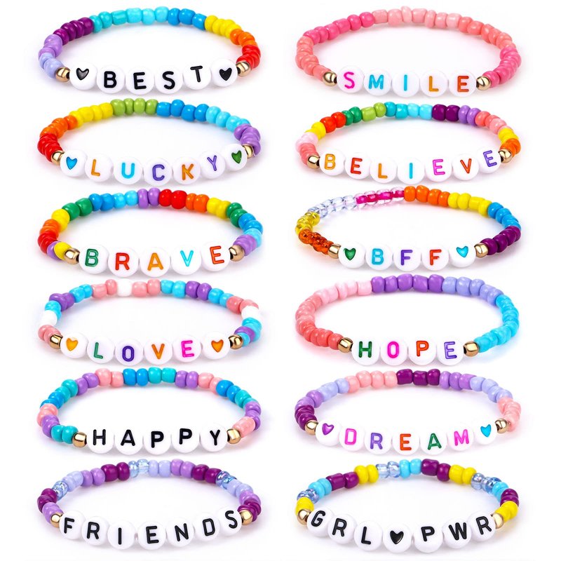 - 【12 Different Letter Bracelets】This kids girls party favor jewelry includes 12 pcs letter bead bracelet,12 pcs different letter such as love, brave,dream,bff etc. Providing your lovely kids with different styles to meet their daily matching