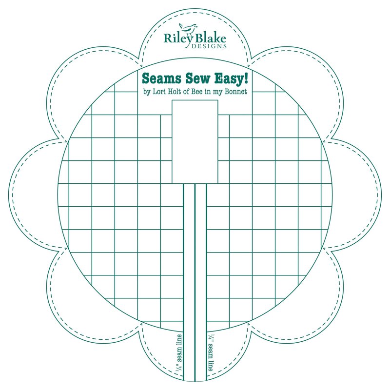 Lori Holt designed her Seams Sew Easy Seam Guide for an accurate 1/4" seam and for constructing easy corner triangles. This tool saves time by not having to mark lines on your fabric when sewing half square triangles, flying geese or snowballs. The center circle of the guide is also marked with 1/2" grid lines for a wider seam allowance. This is a seam guide that temporarily adheres to the bed of any sewing machine. These grid lines also help to ensure correct placement when adhering to your sewing machine bed.