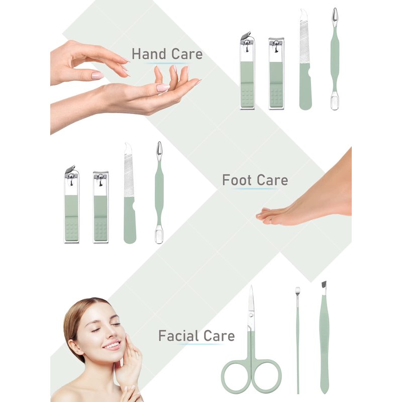 - Multifunctional: Our portable grooming kit are very versatile, for example, flat nail clipper, diagonal nail clipper, nail file, nail cleaner can be used for hand and foot care; eyebrow tweezers, eyebrow scissor, ear clip can be used for facial care.