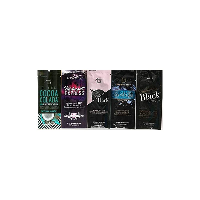 5 Different Tanning Lotion Bronzer from Tan Incorporated Include Black Cocoa Colada, Midnight Express, Way Past Dark, Iced Black Chocolate, Embellish in Black. Packets may vary due to inventory