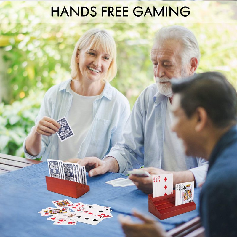 - HANDS-FREE GAMING: No more fumbling around with cards while trying to eat snacks or have a drink; Just place cards in the holders and set your hand in clear view on the table. *Playing cards not included