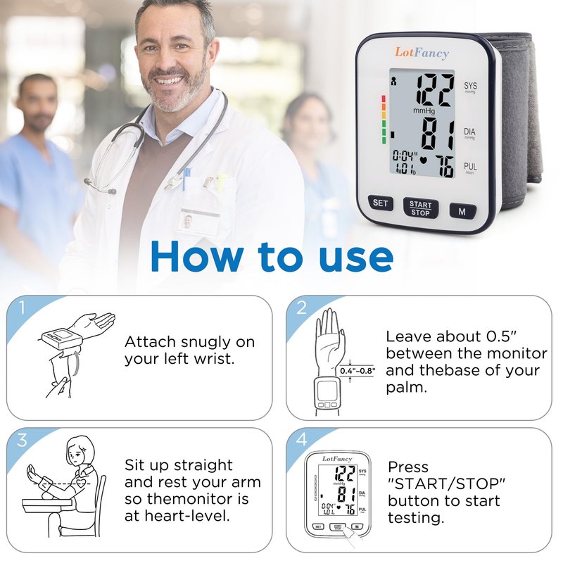- ✔RELIABLE: our blood pressure gauge and wrist cuff kits are validated to detect high bp and irregular heartbeat at home; it will automatically display the average readings from last 3 consecutive records for your reference