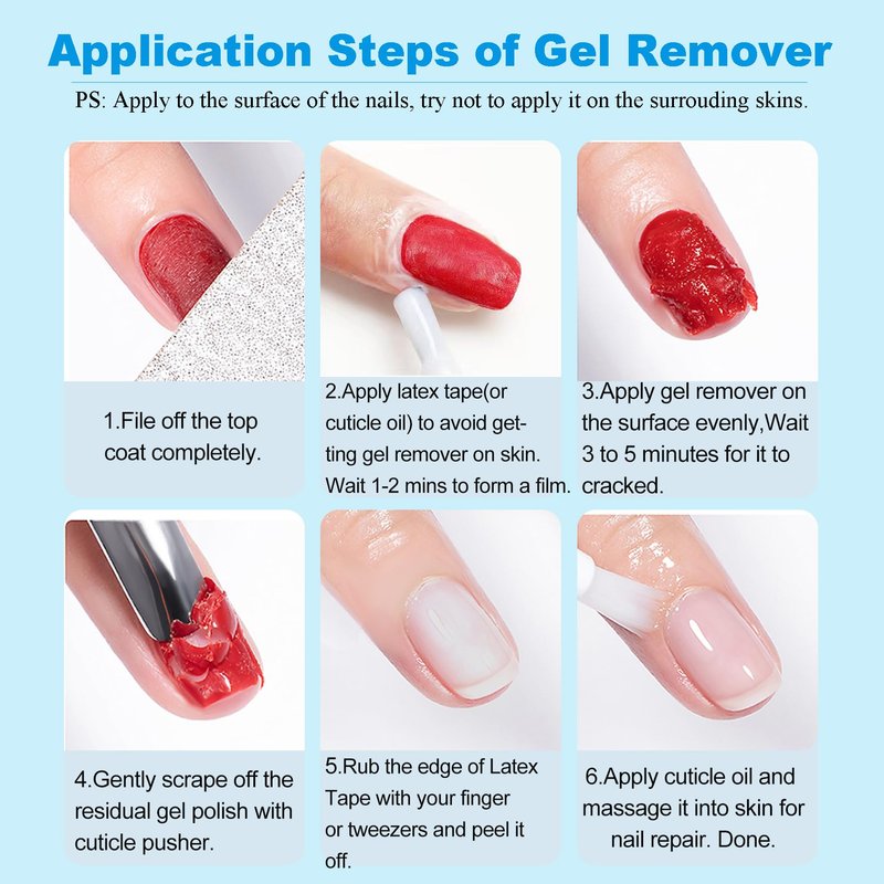 - 💛Professional Gel Nail Polish Remover Combo: you will get 0.5oz gel nail remover and 0.5oz cuticle care oil. It's a great set from removing gel polish to nail cuticle care. You can enjoy a new experience that just "paint" the gel remover over your nails and 3-5 minutes later scrape the gel polish off!