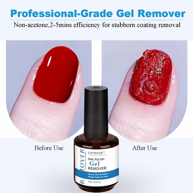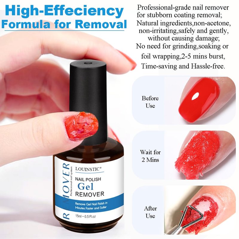 - 💙Gentle Gel Remover for Nails: LOUINSTIC gel polish remover is formulated with specially enhanced organic solvents. The formula is gentle while ensuring removal efficiency. It can quickly pop and remove nail polish without using harsh chemicals or pungent acetone liquid, ensuring a comfortable experience, saving more time and money than going to a nail salon.