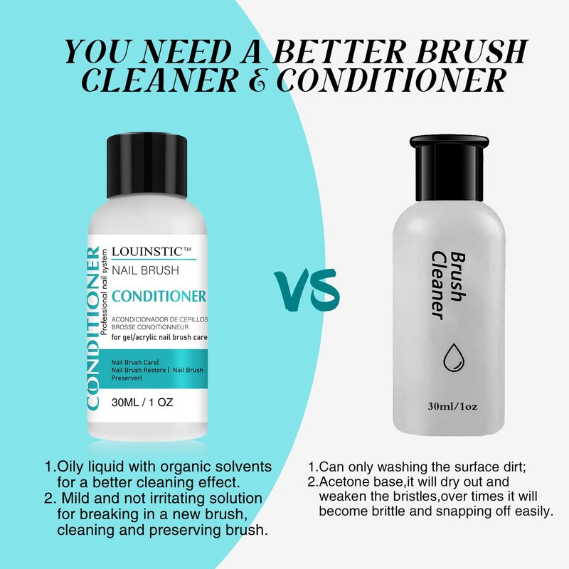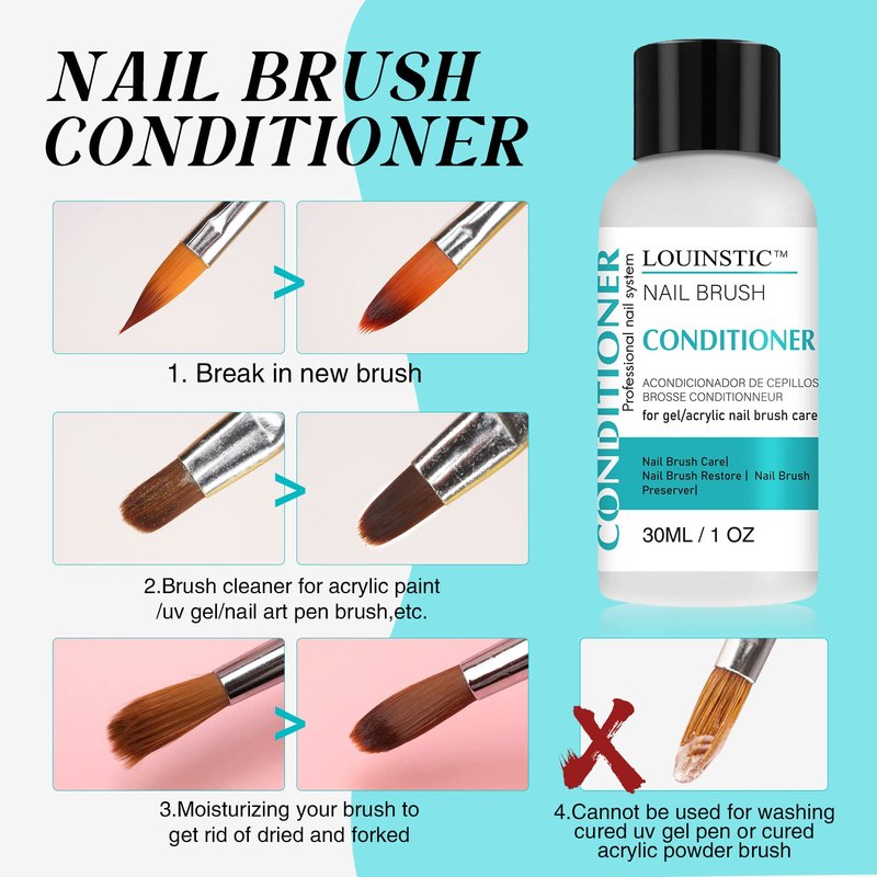 - NAIL BRUSH CLEANER and CONDITIONER: LOUINSTIC brand new brush conditioner is suitable for breaking in a new brush, cleaning and conditioning acrylic paint / uv gel/nail art pen/poly gel nail brushes/ kolinsky acrylic nail brushes. It will keeps brushes longer beautiful and extends the life of your brushes significantly.