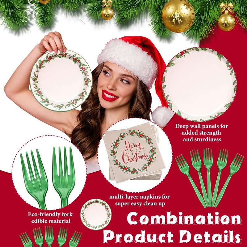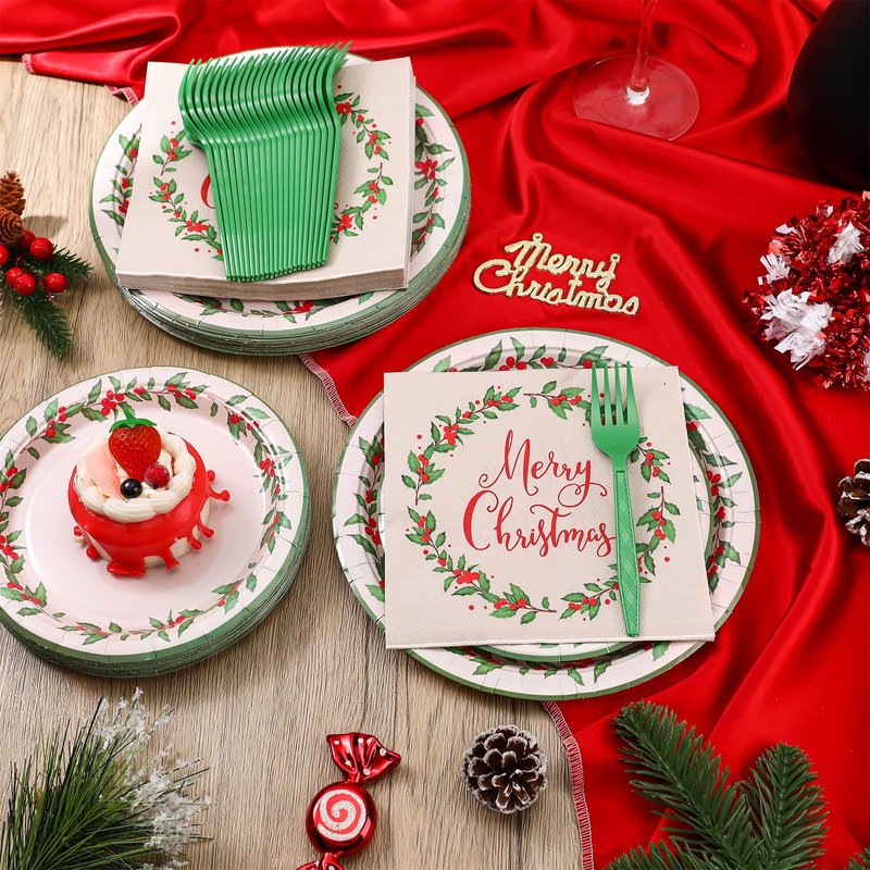 - Christmas Party Supplies: the package includes 48 pcs Christmas paper plates (7 inch and 9 inch), 24 pcs red berries napkins, and 24 pcs forks, a nice combination to serve 24 guests