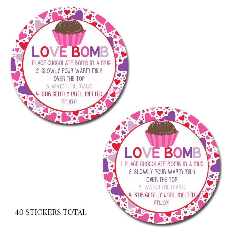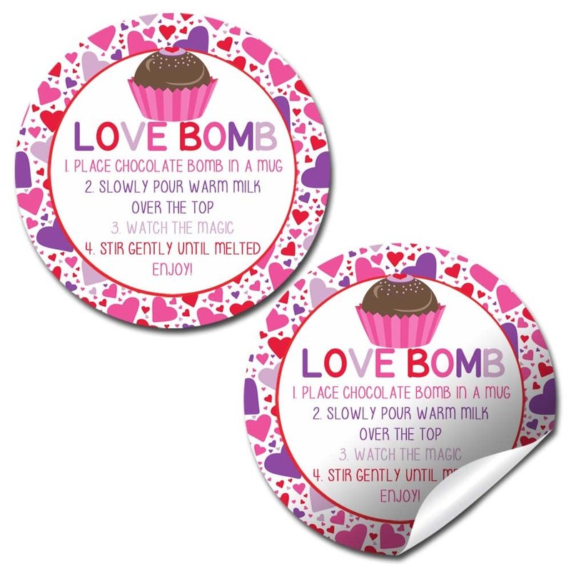 - Cocoa Bomb Overload: Hot cocoa bombs are all the rage this year! Giving some out as gifts and want your packaging to stand out? Designed by a talented mom, these fun stickers feature a cute pink and purple cupcake design, plus all the detailed cocoa bomb instructions to fit perfectly on the package. These are great for making your Valentine's Day hot chocolate bomb gift packs extra special for your friends & loved ones! Amanda Creation. Original design by Amanda Creation.