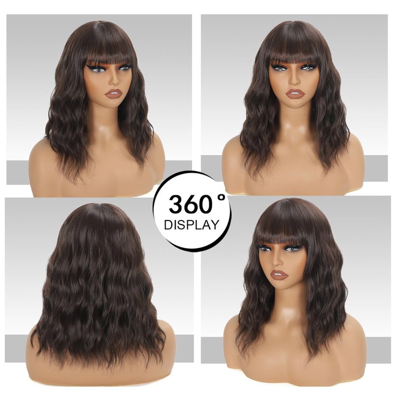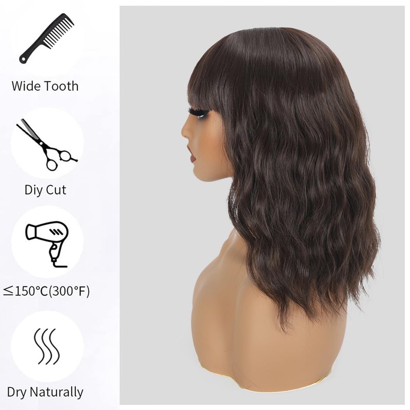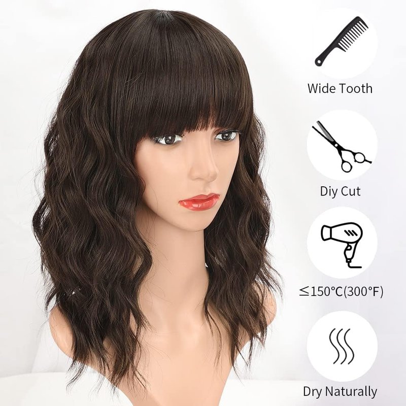 - Quality Hair: Short Brown Wig Synthetic, Premium Quality Japanese Fiber Short Wavy Wig, Strictly Production Control, Natural Wave Wig with Bangs for Women, Soft Touching and Light Weight, Minimum Shedding, Quality Synthetic Wig.