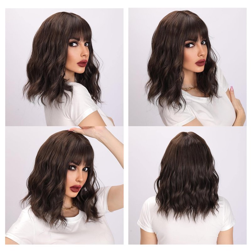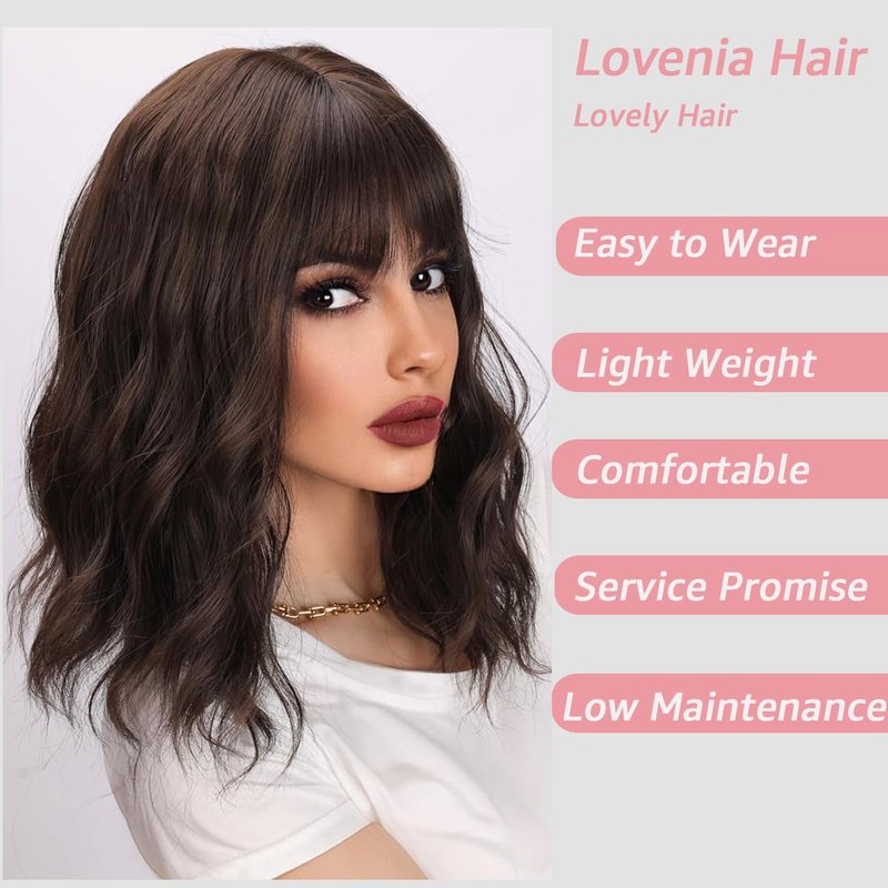 LOVENIA 14" Dark Brown Wig Short Wave Hair Wig for Women Bangs Wig for Beginners Synthetic Curly Wig Body Wave Hair Wig Chocolate Brown Wig Brunette Wig Synthetic Costume Wig(Dark Brown)