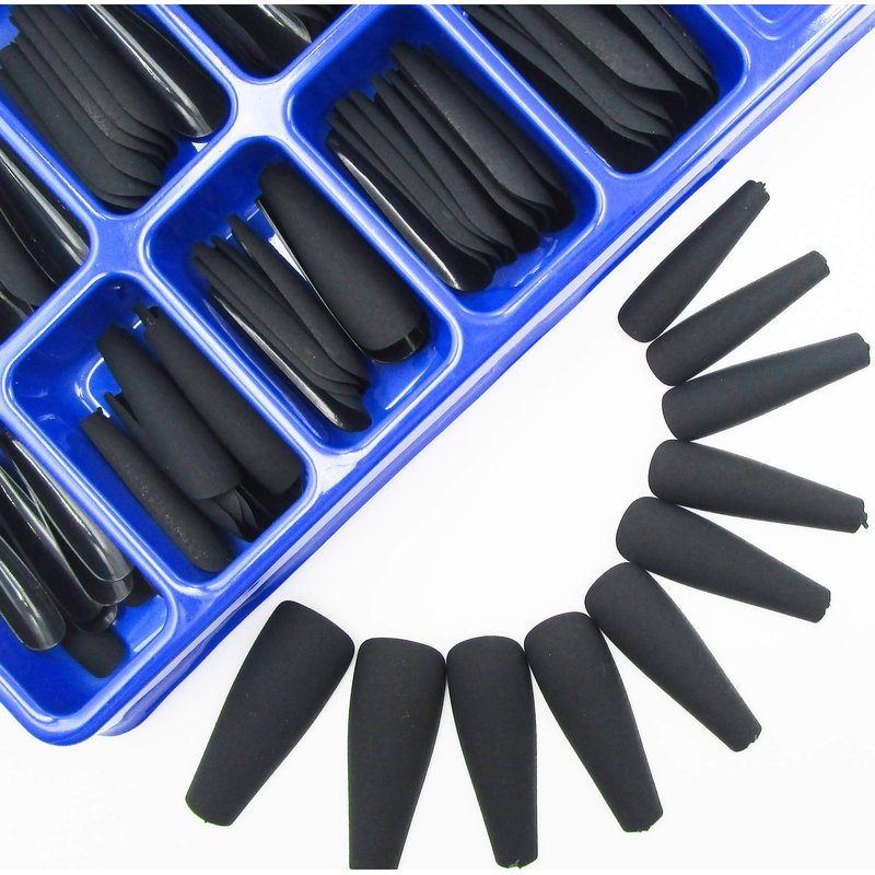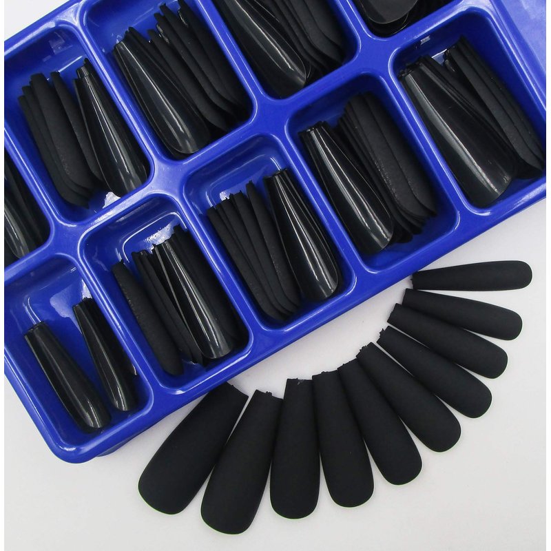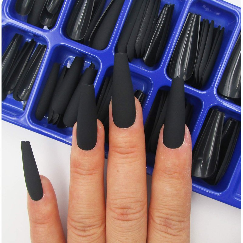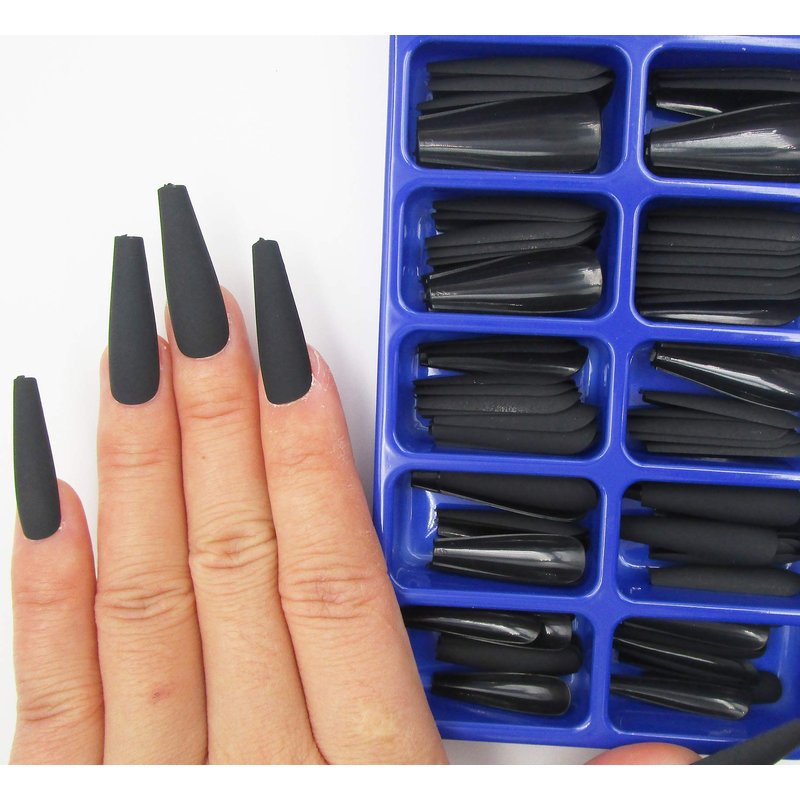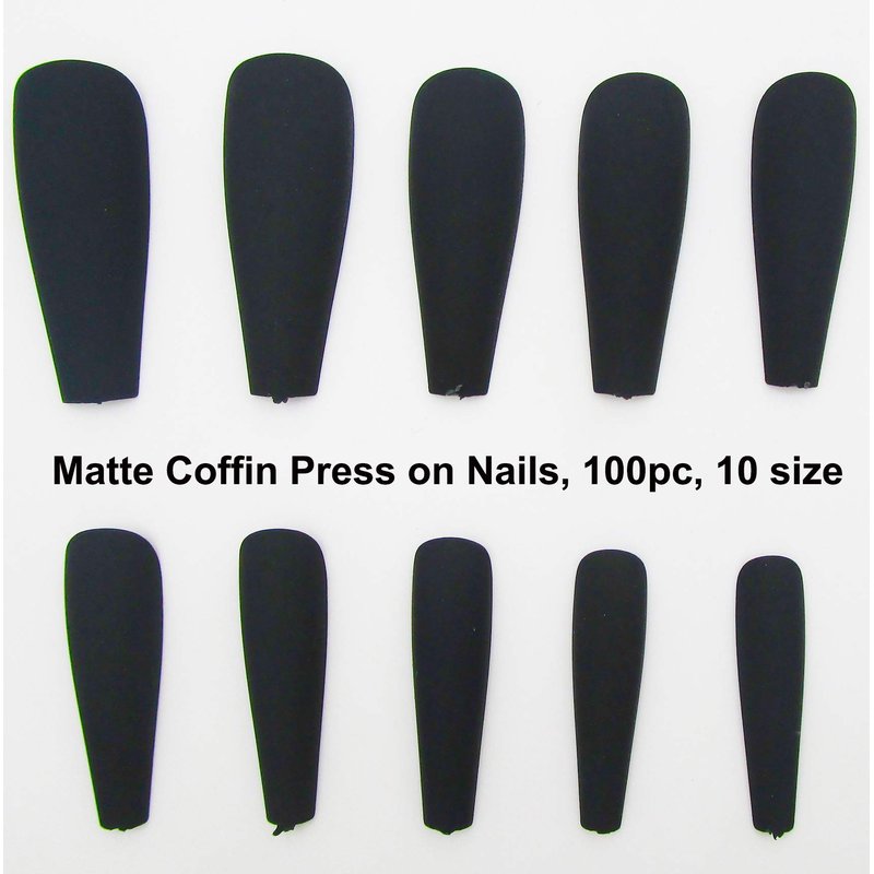 - Long press on nails kit come with 100pc/box pre-colored full cover ballerina coffin shaped fake nails in matte black finish and long length, 10pc coffin nail tips per size, total 100pc matte black press on coffin nails with case, press on nails package faux nails are convenient to carry store and ready for beauty nail gift giving.