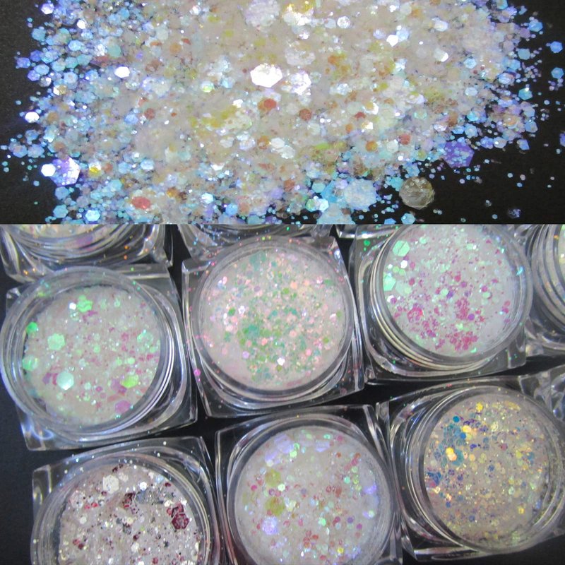 - Extra iridescent chunky glitters, can reflect coloful green, pink, light blue, purple, white, gold, red, yellow, lemon, rose, silver. Works amazing for holiday festival face makeup and body painting, resin epoxy and acrylic nail art.