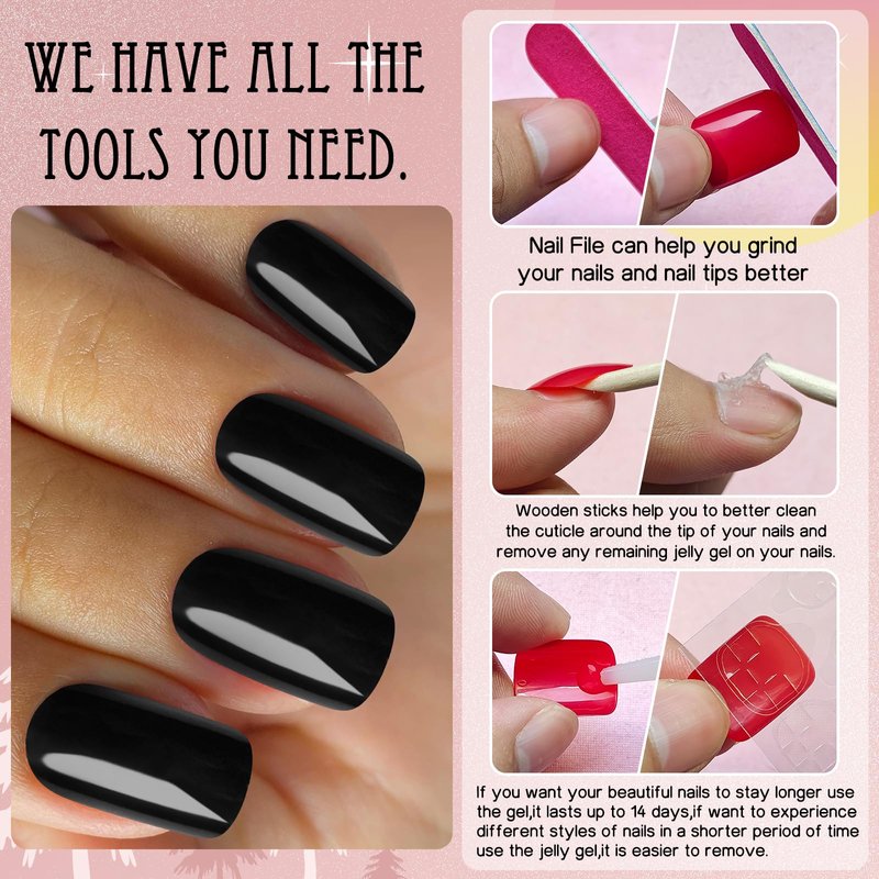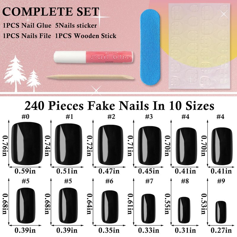 - Reusable Press on Nails Kit for Easy Manicures:Black fake nail kit with glue come with 240pc shine gel glossy finish black color short square shape press on nails in 12 sizes, 1pc nail file, 5 sheet sticky nail stickers, 1 tube nail glue, 1pc wooden stick for removing nails tips. Simple press on nails set with basic nail supplies for women and girls at home manicure, salon nail techs nail design or on the go nail DIY.