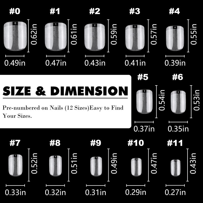 - Square shape fake nail tips for wide/small hands, soft gel nail tips are natural square shape, full cover design. Featured with 12 different sizes,pre-numbered from 0-11, easy to find the most suitable size nail tips to fit your every finger nails,no matte large/wide nail beds or narrow/small nail beds.