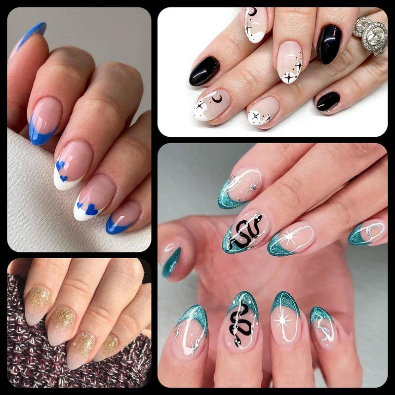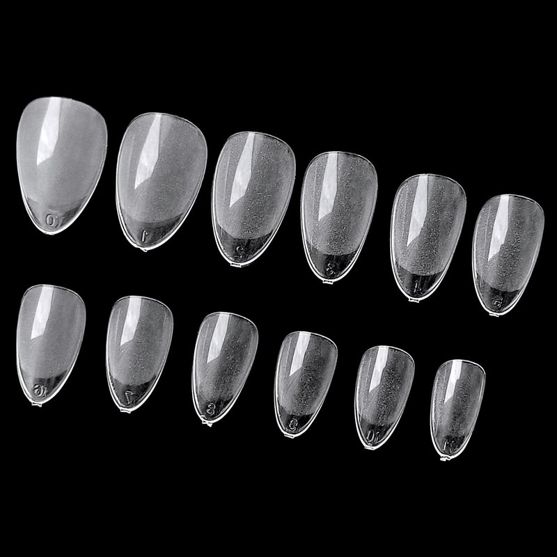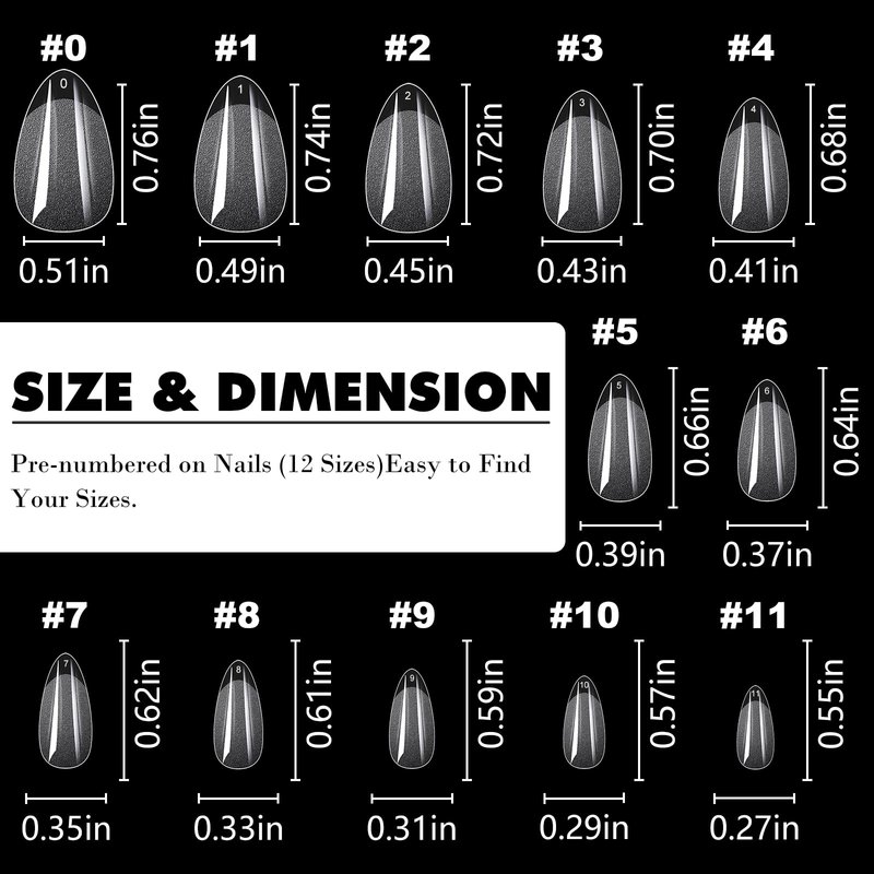 - Stiletto almond shape fake nail tips for natural/small hands, soft gel nail tips are oval almond shape, full coverage design. Featured with 12 different sizes,pre-numbered from 0-11, easy to find the most suitable size nail tips to fit your every finger nails,no matte large/wide nail beds or narrow/small nail beds.
