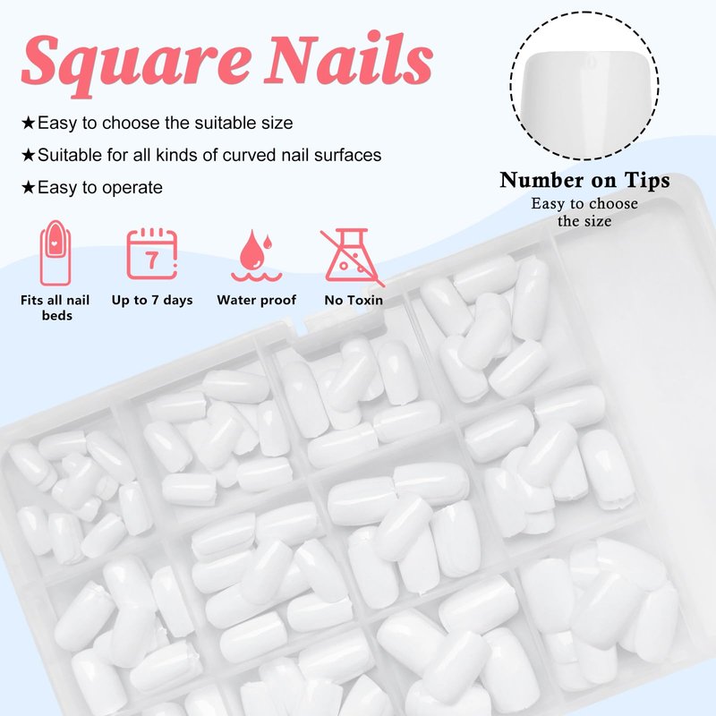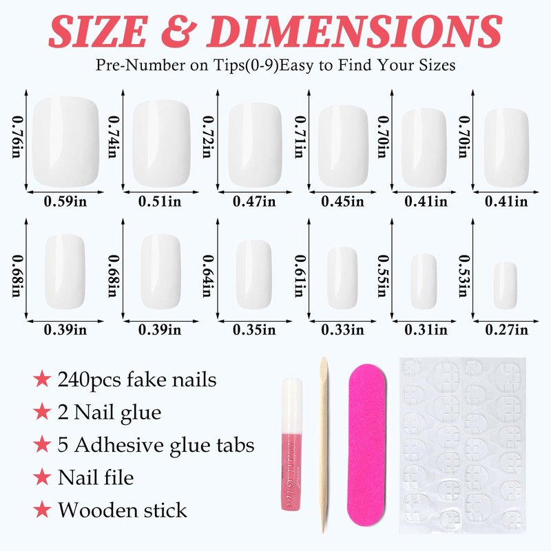 - Glue on Press on Nails Kit: Short square press on nails kit includes 240pc short square shape white press on nails with 2 bottle liquid strong nail glue, 5 sheet sticky sticker nail adhesive tabs, 1pc nail file, 1pc wooden sticks. A complete fake nail kit with everything for women and teen girls achieve a quick at home manicure.