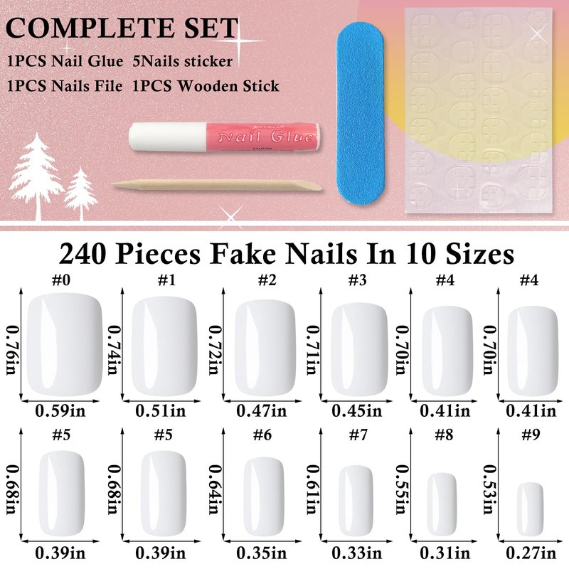- Reusable Press on Nails Kit for Easy Manicures:White fake nail kit with glue come with 240pc shine gel glossy finish white color short square shape press on nails in 12 sizes, 1pc nail file, 5 sheet sticky nail stickers, 1 tube nail glue, 1pc wooden stick for removing nails tips. Simple press on nails set with basic nail supplies for women and girls at home manicure, salon nail techs nail design or on the go nail DIY.