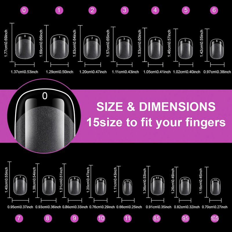 - Full Size Gel x Nail Tips Square Shape: Full nail tips short square tips include 420pc full nail tips tapered square shape with 15 sizes, easy to choose the suitable size nail tips square for every fingernail. 28pc square nails per size, total 420pc xs short square nails tips pack. Clear square tips look short press on big nail beds, longer on small nail beds. Short round square gel nail tips can be customized and reshape by cutting the nails to your desired length, perfect for nail lovers to DIY!
