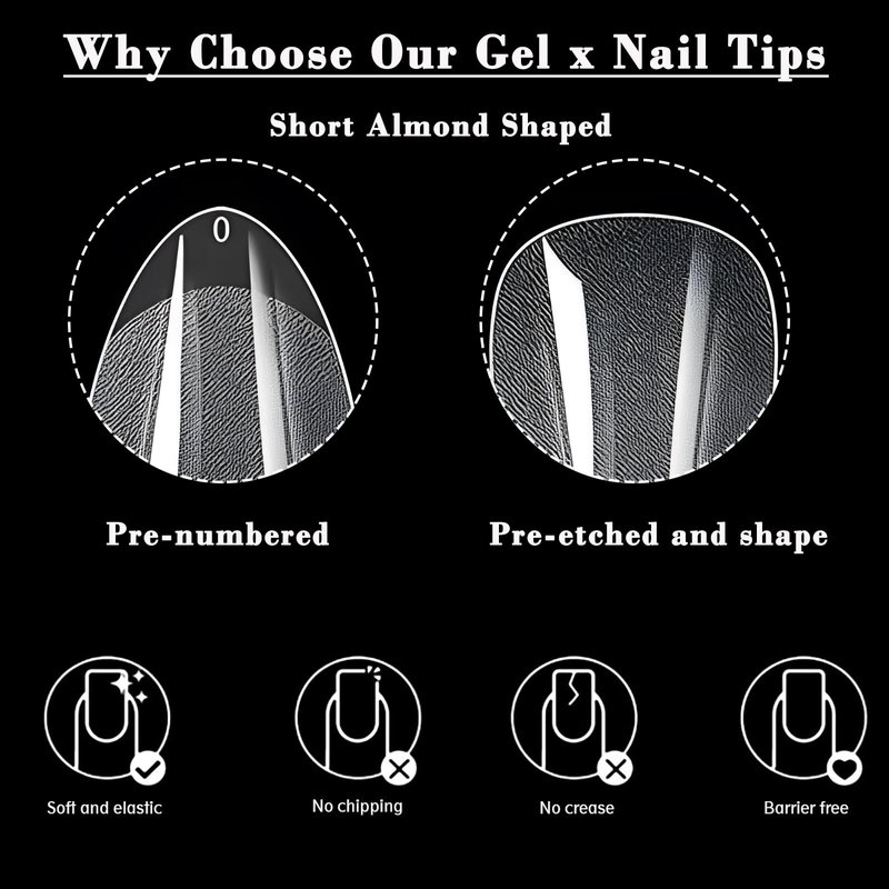 - Artificial gel x fake nails are made of high quality soak off soft gel material, gel x tips are flexible, durable and sturdy, not easy to crack/break/deform/bend. Soft gel almond nails are gel x nail extension tips for nail salon nail techs and nail art beginner/love acrylic nail extensions or press on nails making.