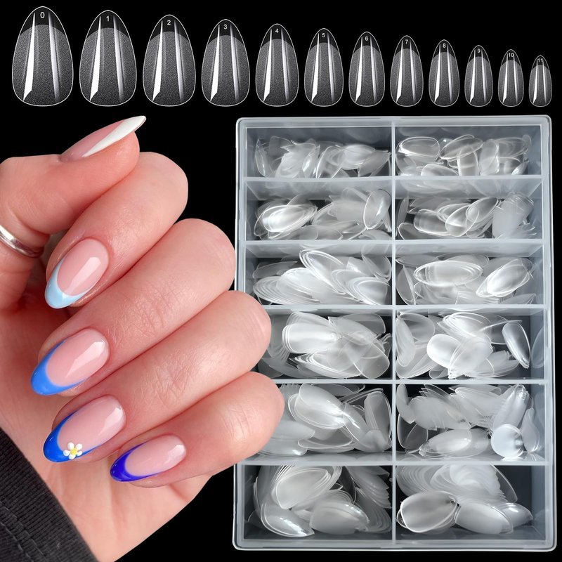 - Clear nail tips for acrylic nails professional almond shaped includes 600pc xs short stiletto almond soft gel nail tips, package in clear case. Clear press on nails short almond fake nail are easy to storage that won't spilled to everywhere and ready for beauty nail gift giving to women and teen girls.