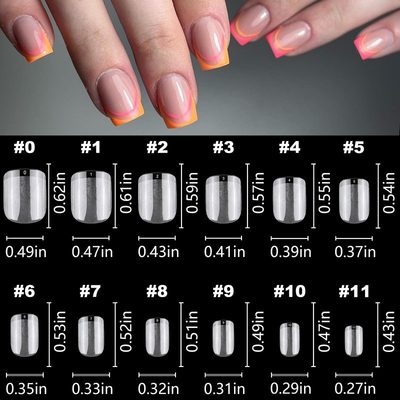 - Perfect shape and length soft gel short nails, short gel x square nail tips are perfect short length, tapered square shape full coverage design gel x short nail tips. Full cover square nail tips featured with 12 different size from 0-11, soft gel fake nails are convenient to choose the most suitable size nail tips to fit every finger, no matter you have wide/curve/flat/small nail beds fingers.