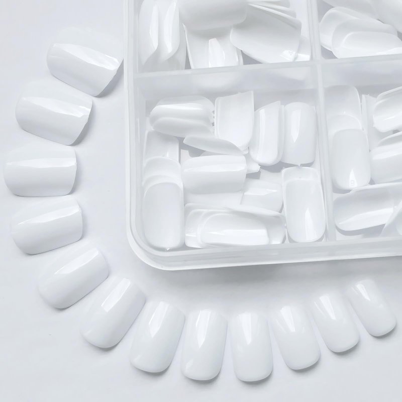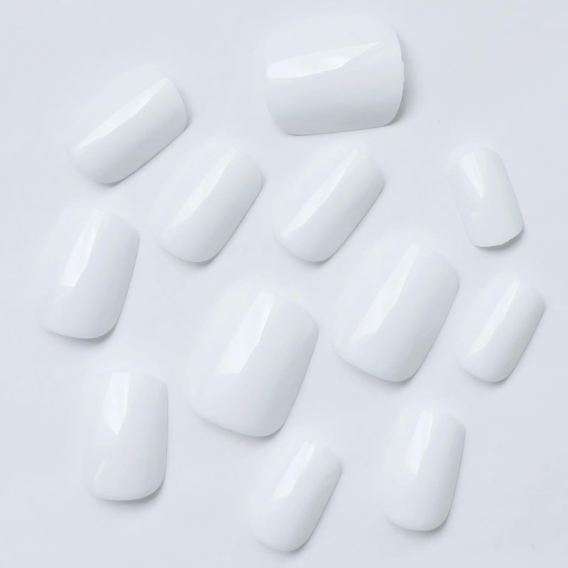 - Glossy glue on nails short square press ons fingernails are made of quality ABS material, shor t false nails are sturdy,flexible and durable, won't break,fade color, crack and deformed easily. Odorless short square nail tips are without harm and damage to your natural nails or your body. High glossy short fake nails with classic white color, look trendy, bright and vibrant on fingers.