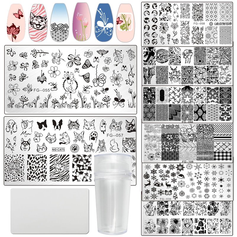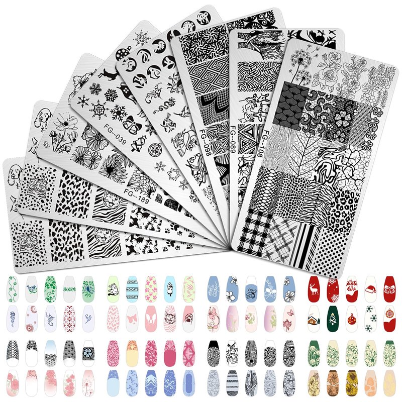 - Professional Nail Stamping Kit contents 8pc nail stamping plates templates with different image pattern and 1 set silicone and clear nail stamper scraper Allows you create endless summer, autumn nails arts designs. Great manicure tools for nail salon techs and home nail art starters