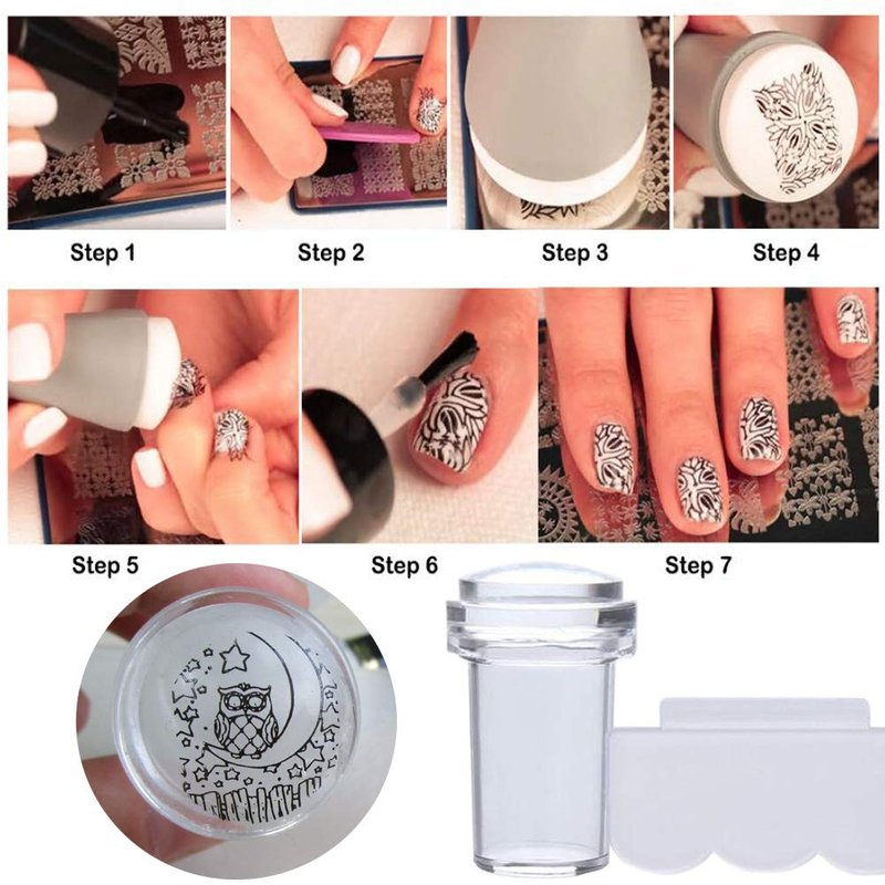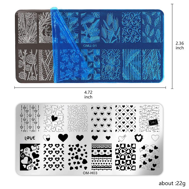 - These nail stamping plates are made of stainless steel, sturdy and durable. Steel stamping plates are reusable and washable, can use for long time with proper maintain. The clear silicone nails stamper soft and Q bomb. Can pick up the image easily and display image exactly. Kindly caution that all stamps plates are cover with blue film, you should peel it off before use.
