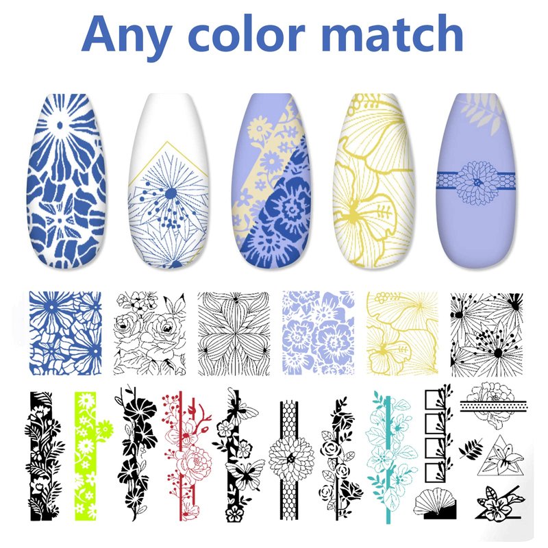 - Designer nail stamping plate set featured with various cute and trendy pattern image,there are flower, love, letters,lace, butterfly, heart, geometric, leaves print stamping plates, offer you multi choice to diy beautiful and stylish manicure without painting and drawing pattern.