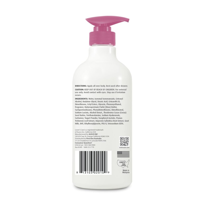 - Lovercare Goat Milk Body Lotion is the perfect solution for dry, cracked skin. Our lotion is enriched with high amounts of protein, fat, iron, and lots of vitamins naturally found in goat milk. With a pH nearly the same as human skin, it easily absorbs into your skin, leaving no greasy residue. Our Cherry Blossom lotion helps to fight against free radical damage, giving you youthful-looking, radiant skin. Shea butter, another essential ingredient, is an excellent skin conditioner, with added benefits of Vitamins F & E. It helps soothe the skin with frequent use and is non-irritant. Our lotion also contains yogurt, which is rich in protein for moisturizing and skin smoothing. Lovercare Goat Milk Body Lotion is friendly for everyone, dermatologist tested, cruelty-free, gluten-free, and sulfate-free. It's perfect for extra sensitive skin, nourishing and conditioning it without leaving a greasy residue. Try our Cherry Blossom variant in the 27.05oz (800ml) size for long-lasting nourishment.