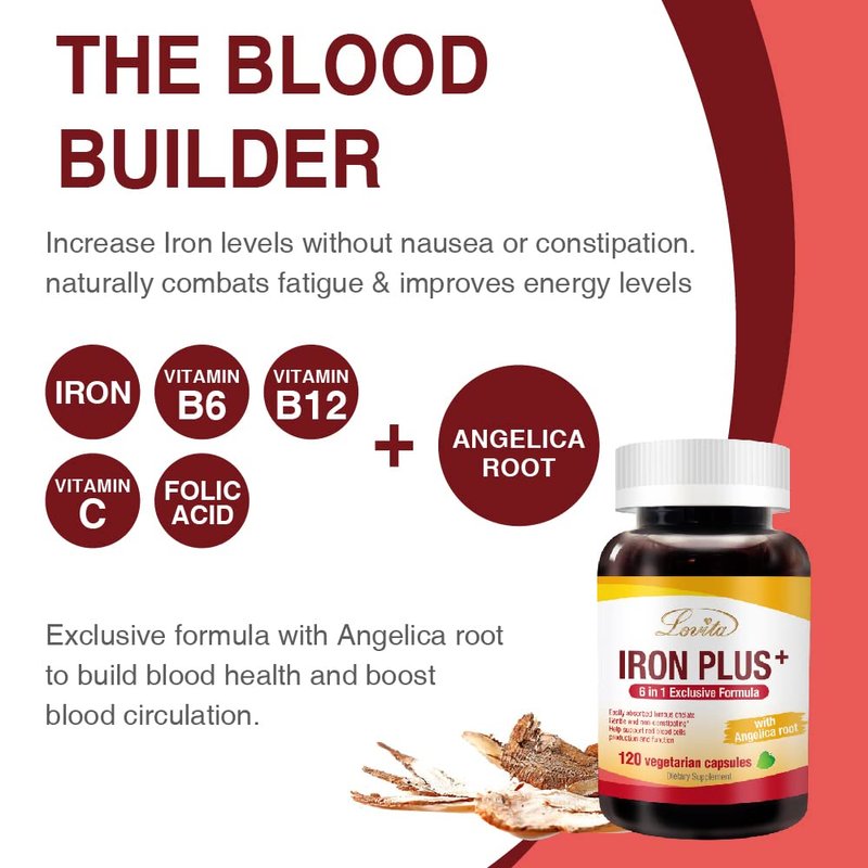 Lovita Iron Plus+ is a premium formula with vitamin B complex and C. It supports red blood cell production and helps the delivery and utilization of oxygen. Angelica Extract is a herb with a long history of use, which can maintain the physiological function and health of women.