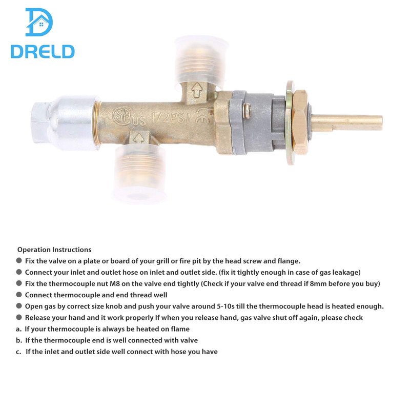 - HOW TO USE: Fix the valve on a plate or board of your grill or fire pit by the head screw and flange. Connect your inlet and outlet hose on inlet and outlet side. Fix the thermocouple nut M8 on the valve end tightly. Connect thermocouple and end thread well. Open gas by correct size knob and push your valve around 5-10s till the thermocouple head is heated enough. Release your hand and it works properly. If the gas valve shut off again when you release hand, then please check.