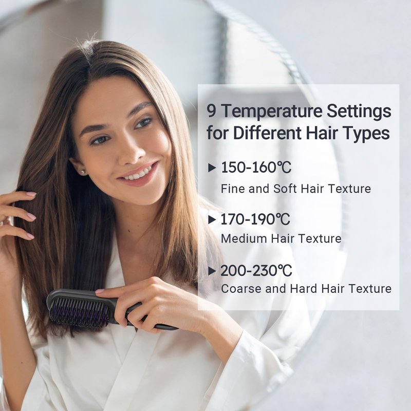 - 9 TEMPERATURE ADJUSTMENT - The straightening brush for women comes with 9 heating temperature settings. You can adjust the temperature from 150℃ to 230℃ based on your hair type.