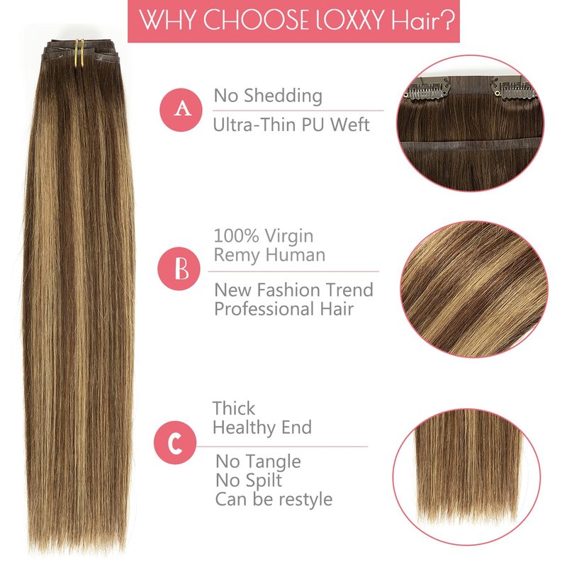 Loxxy PU clip in human hair extensions made with 100% remy human hair which is super healthy, soft and silky from the roots to the ends,No shedding, no tangle, no lices. All of the loxxy hair are directly cut from the young lady without any synthetic hair. We have many years of production experience, strict quality control system and professional service. If you want to get the premium quality real human hair extensions,Loxxy is your best choice.