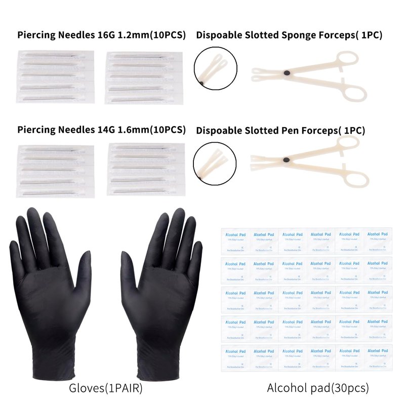 - 54pcs Piercing Kit tools: Black Latex Gloves(2PCS) 14G Piercing Needles(10PCS)16G Piercing Needles(10PCS)Disposable Piercing Clamps(2PCS). 30pcs other All items are 100% sterilized using ethylene oxide (EO) gas and packed safely