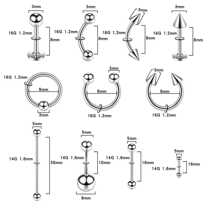 - 50pcs Piercing Kit jewelry:50pcs new body piercing jewelry set. Includes many different styles of jewelry (14g, 16g). Use: tongue rings nipple rings belly button rings eyebrow rings nose ring lip piercing industrial piercing dermal piercing barbell piercing jewelry bulk