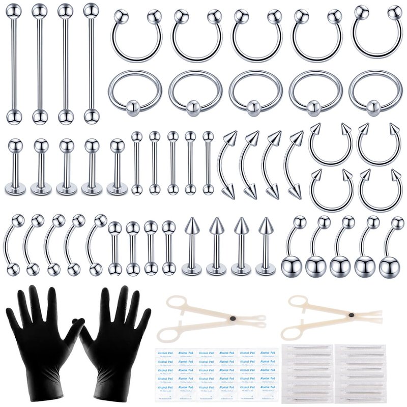 - Piercing Kit: 104PCS body piercing kit for ear cartilage tragus eyebrow nose septum lip piercings Needles gloves and tools are included