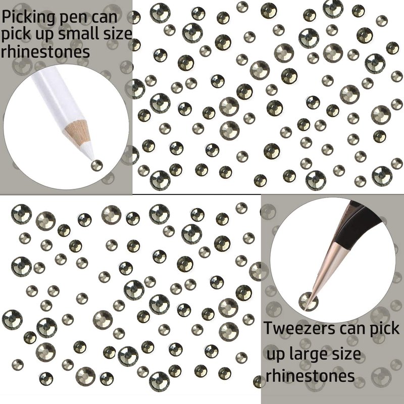 - Package includes: you will get additional 4pcs different colors nail striping tape as gift, 3456pcs flatback glass rhinestones in 6 sizes, with good quality tweezers and picker wax pencil.