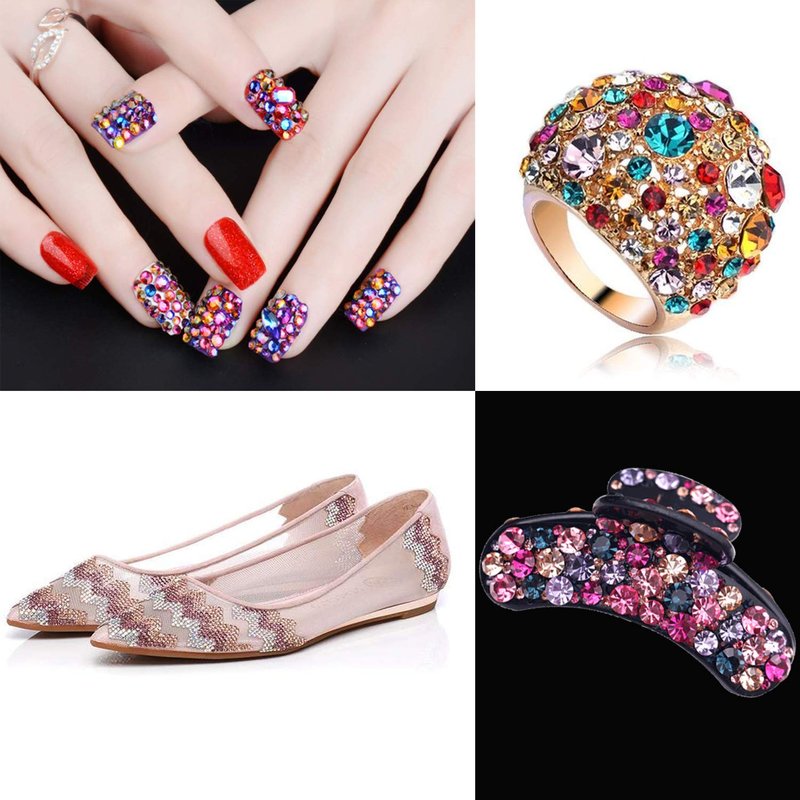 You can use these crystals to decorate your phone, nail art, card crafting, shoes, wedding dress, books, guitar, tablets, car plates, table scatter and so on.