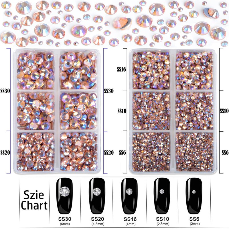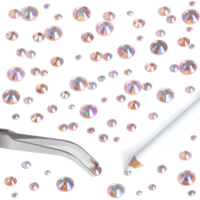 - Package includes: Champagne AB 6400pcs flatback glass glittering hotfix rhinestones bulk in 5 sizes, with good quality tweezers and picker wax pencil.