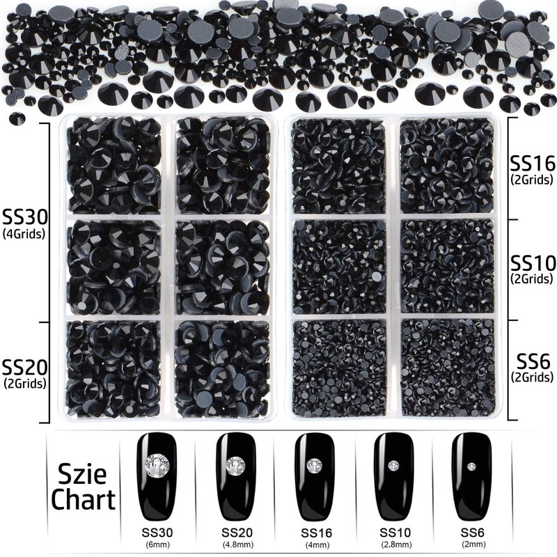 LPBeads 6400 Pieces Hotfix Rhinestones Black Flat Back 5 Mixed Sizes Crystal Round Glass Gems with Tweezers and Picking Rhinestones Pen